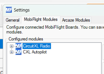 You should see all your devices listed when you click the "MobiFlight Modules" button, as shown below